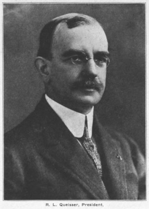 QUEISSER, Robert L.;1 pres. The Queisser-Bliss Co.; born, Indianapolis, Ind., Aug. 9, 1866; son of Julius and Caroline J. Schliebitz Queisser; educated, Indianapolis public and high schools; married, Springfield, O., Nov. 24, 1887, Jessie L. Fried; two sons, Charles Fried, and Robert L., Jr.; regimental adjutant, 3rd Regiment Inf. O. N. G.; battalion adjutant 7th Regiment Inf., O. N. G.; captain commissary, 5th Regiment Inf., O. N. G.; aide-de-camp on staff of Gov. Judson Harmon, four years; former pres. Chamber of Commerce, Zanesville; spent early life in railroad work, leaving a responsible position in the traffic department of The Baltimore & Ohio R. R. to become mgr. of The Ohio Press Brick Co., of Zanesville, one of the subsidiary companies of the Hydraulic Press Brick Co., of St. Louis, Mo.; remained with that company five years, when with William H. Hunt and C. A. Bliss,2 organized The Hunt-Queisser-Bliss Co., of Cleveland, and entered the brick and builders supply business; three years ago, acquired Mr. Hunt’s interest in the Company, and the corporate name was changed to the Queisser-Bliss Co.;3 past pres. Brick Building Ass’n of America;4 sec’y Ohio Face Brick Manufacturing Ass’n; sec’y-treas. The Face Brick Dealer’s Ass’n of America;5 pres. and mgr. The Queisser-Bliss Co.; Past Exalted Ruler, Springfield, O., Lodge, No. 51, B. P. O. Elks of the U. S.; member Emanuel Lodge, No. 505, F. & A. M.; McKinley Chapter, R. A. M., Past Grand Esteemed Leading Knight, B. P. O. Elks of the U. S.; Past Comander [sic], Coeur de Lion Commandery, Knights Templar. Past Vice Regent Snark of Ohio Concatenated Order of Hoo Hoo [sic];6 director International Ass’n of Rotary Clubs;7 pres. Cleveland Rotary Club, 1913; member Athletic, City Club, Masonic Club, Shaker Heights Country Club, Automobile Club,8 and member and director (1914) Chamber of Commerce, chairman membership committee of the Chamber; member Cleveland Builders’ Exchange; associate member Cleveland Engineering Society.